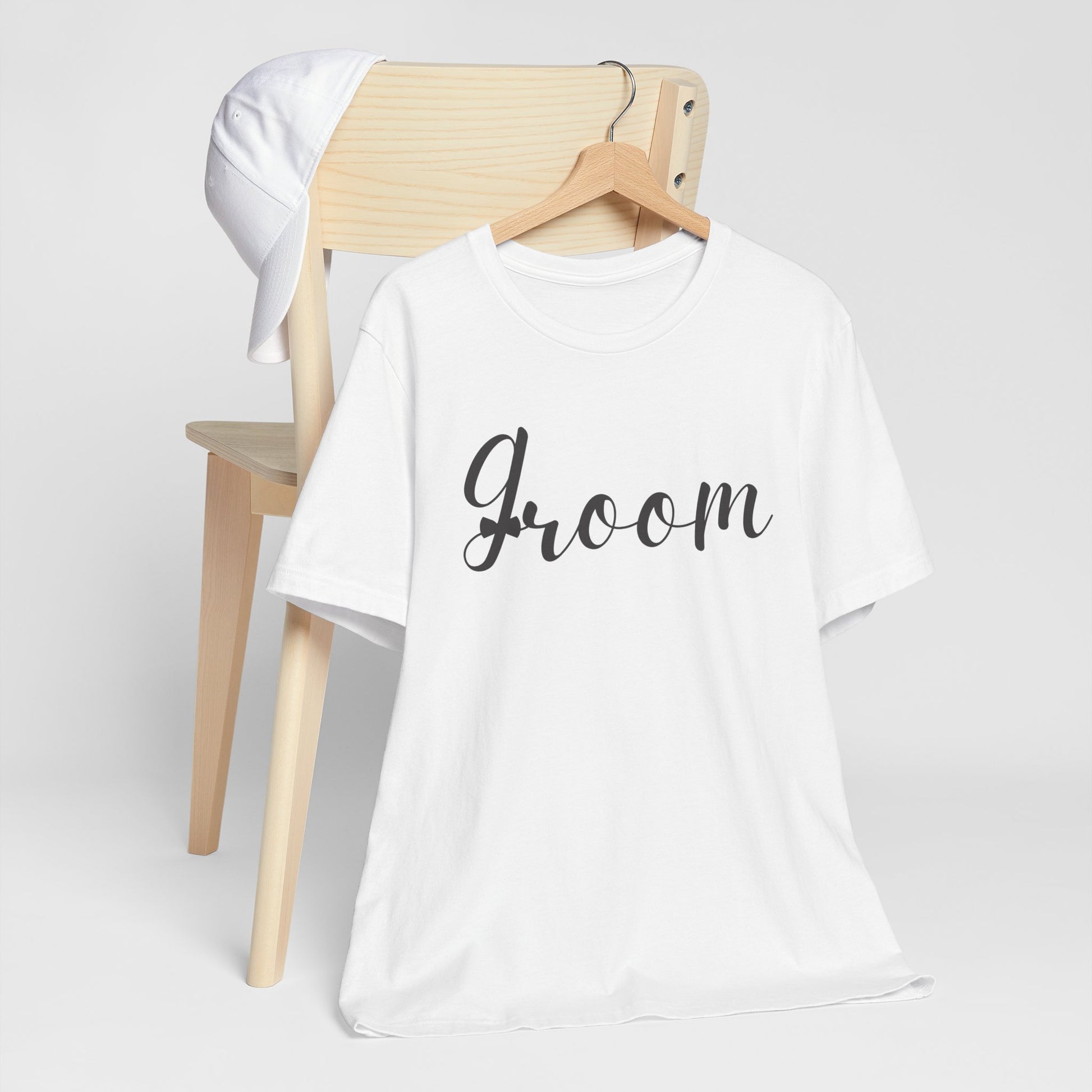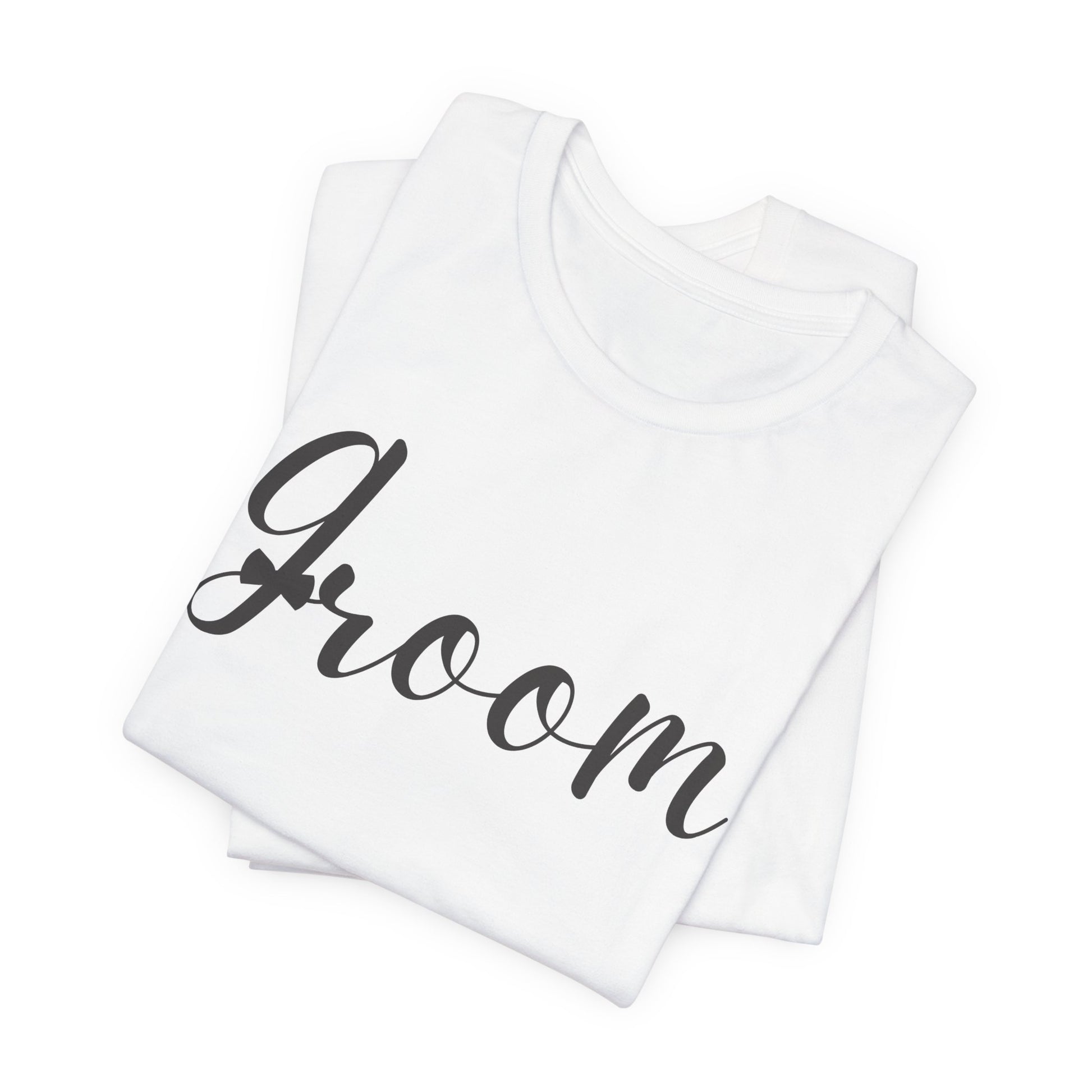 Dress the groom in style with this unique "Groom" t-shirt, where the letter 'G' is stylishly adorned with a bowtie, adding a touch of sophistication and whimsy. Perfect for the bachelor party, rehearsal dinner, or as a relaxed wedding day outfit, this t-shirt blends casual comfort with ceremonial charm. It’s an excellent gift for the groom to wear during his wedding festivities, offering a blend of fun and formality.