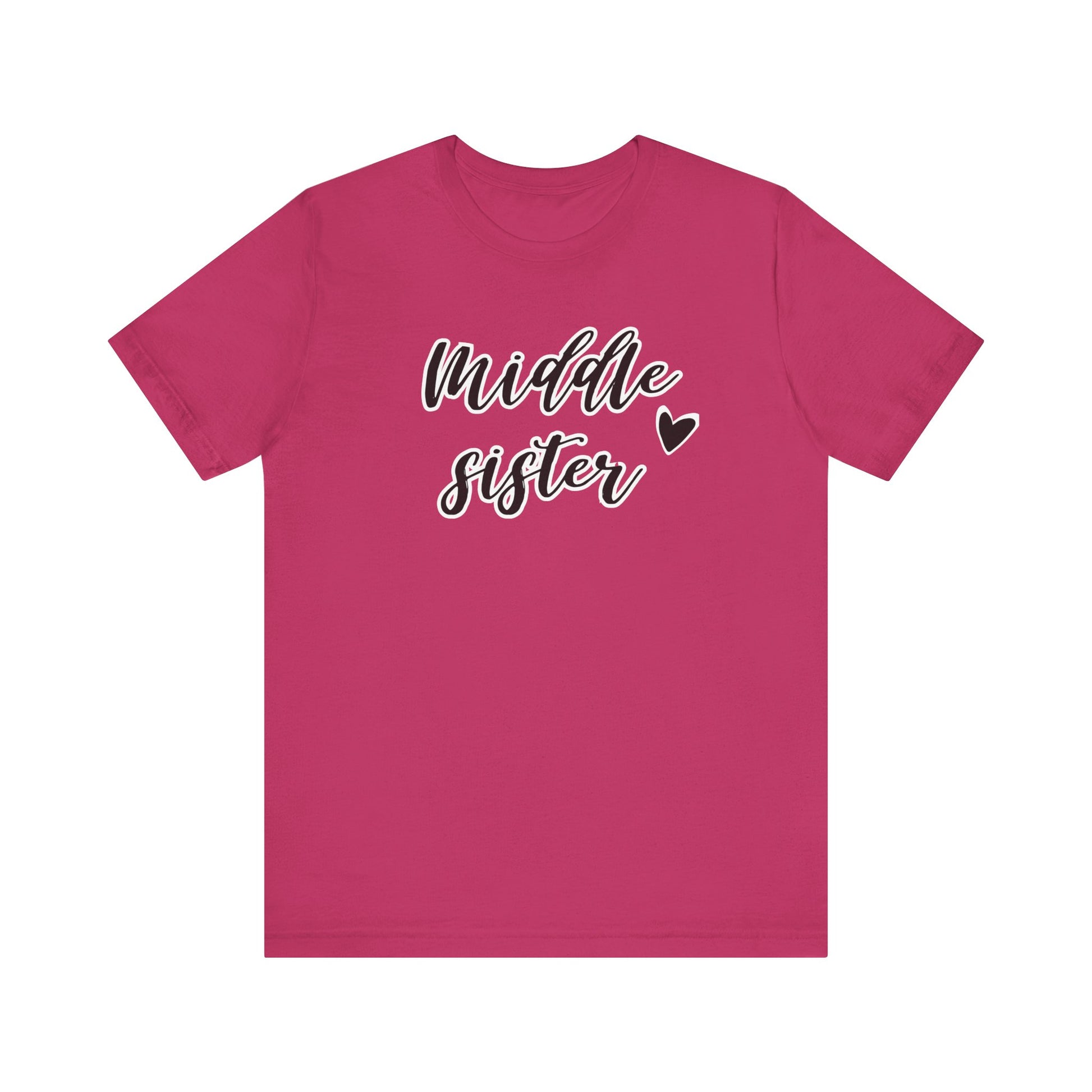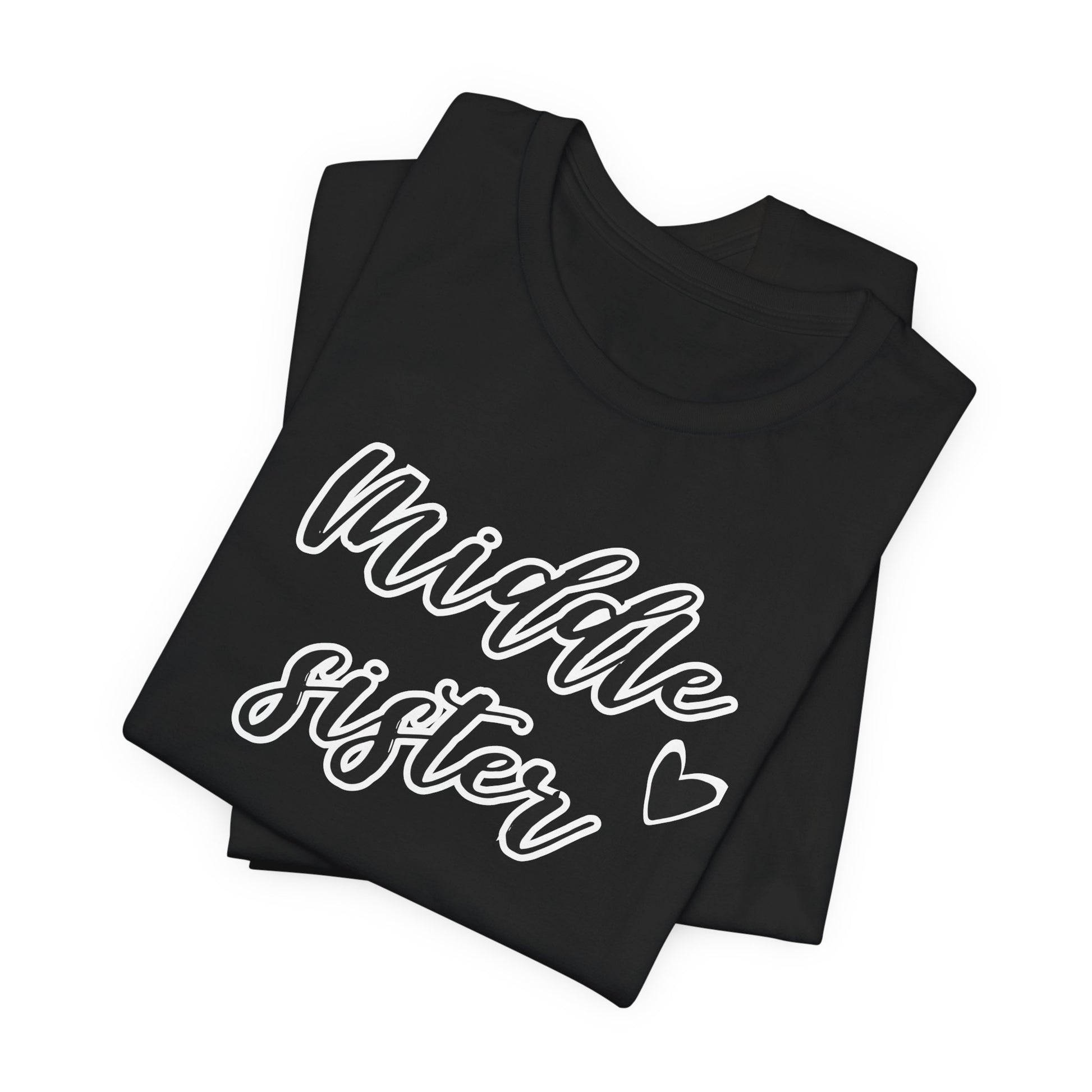 Celebrate the special bond of the middle sister with this beautifully designed "Middle Sister" t-shirt. The elegant cursive script, enhanced with hearts, perfectly represents the love and unique position she holds within the family. Ideal for family gatherings or as a thoughtful gift, this tee is a wonderful way for a middle sister to show off her irreplaceable role with pride and style.