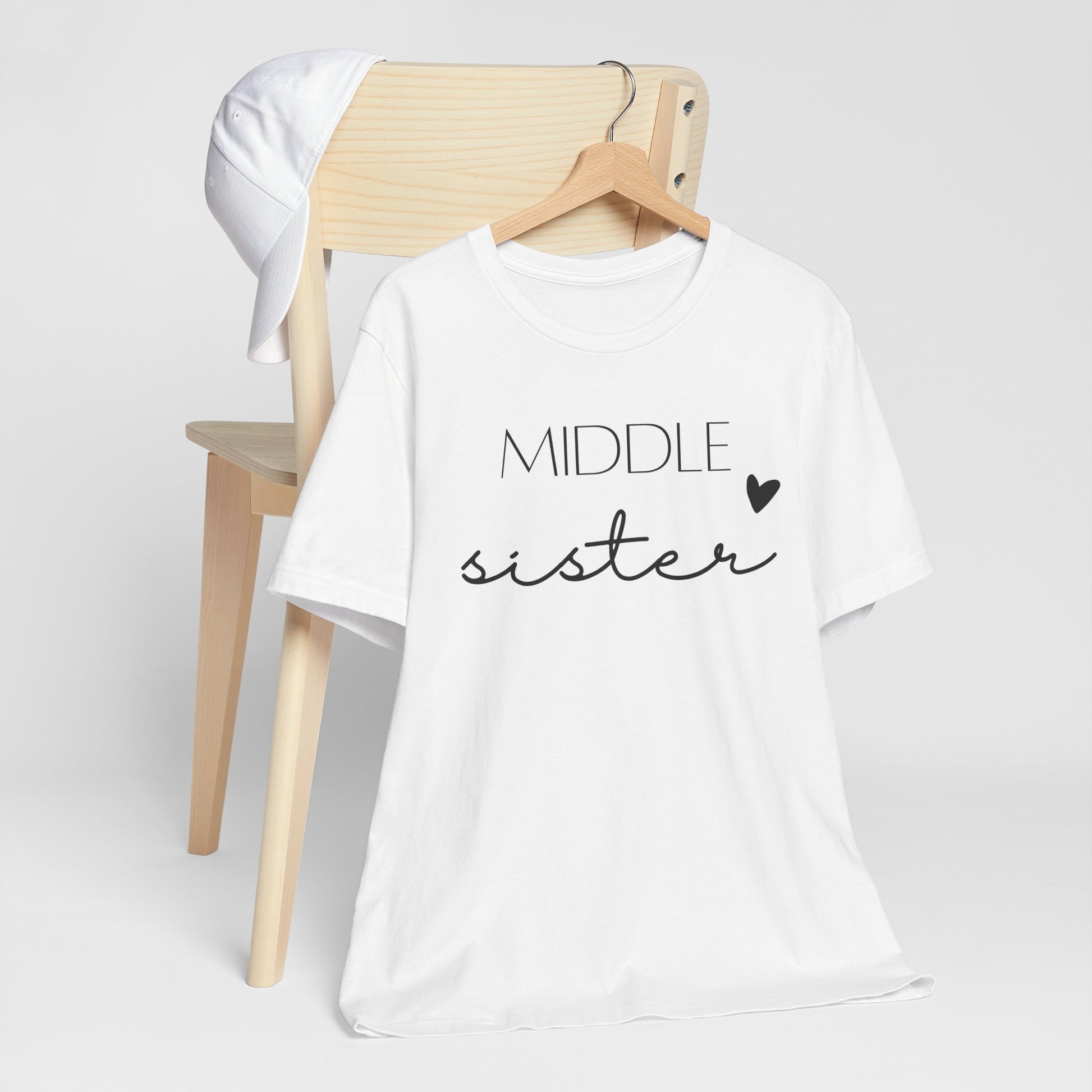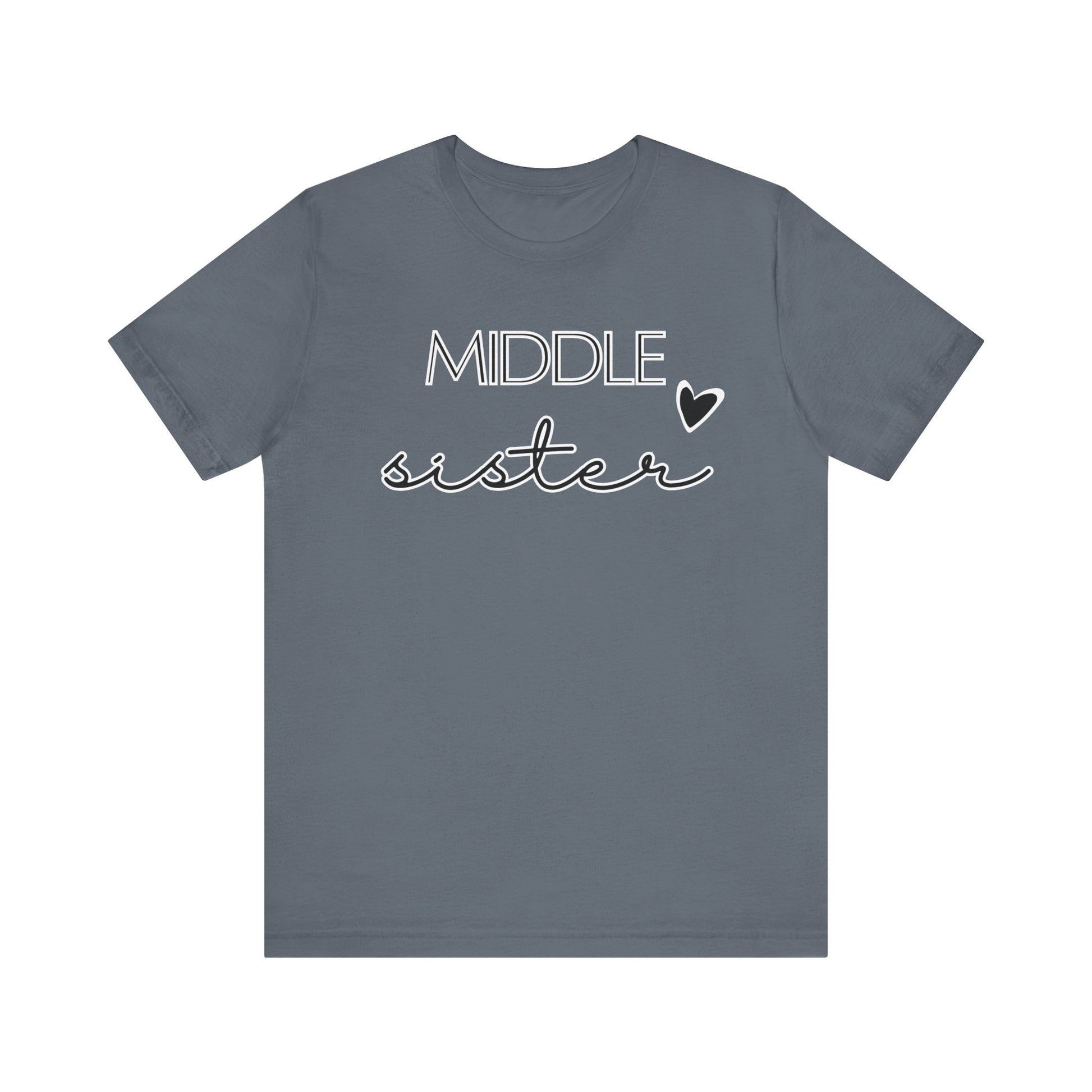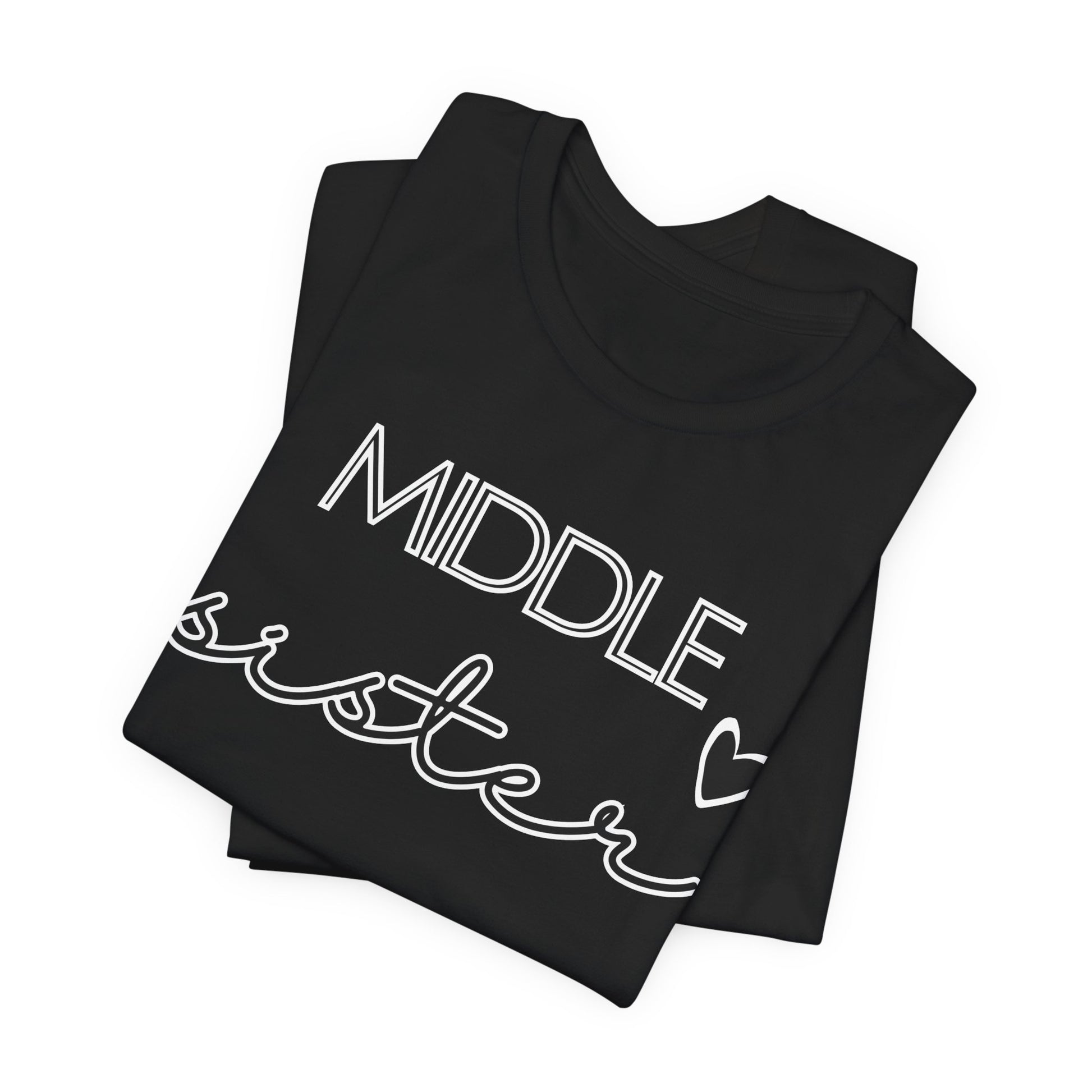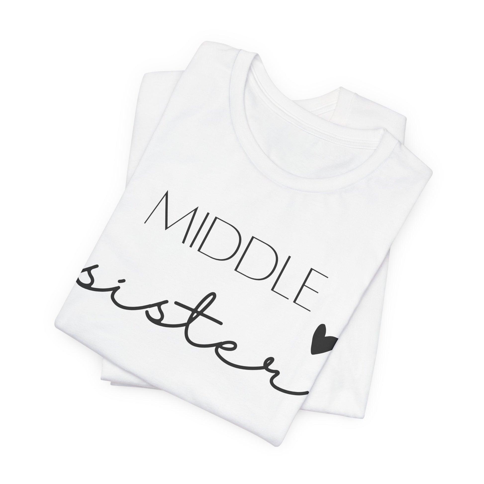 Show off the unique charm of being in the middle with this "MIDDLE sister" t-shirt. The design pairs bold, contemporary lettering with a playful cursive script, topped with a heart to symbolize love. Perfect for the girl who keeps the family bonded, this shirt celebrates the special role of a middle sister with flair and fun. It's great for family reunions, daily wear, or as a thoughtful gift that honors her unique position within the family.
