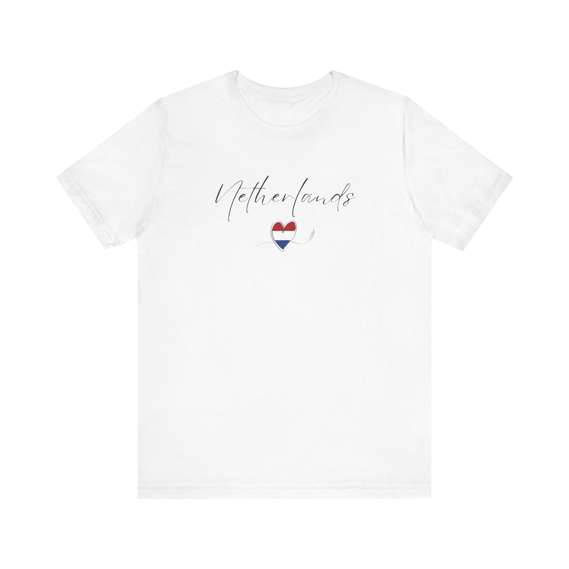 Embrace your love for the Netherlands with this unique Jersey Short Sleeve Tee! The design features the word "Netherlands" artistically integrated with the vibrant Dutch flag in the shape of a heart. This eye-catching graphic sits boldly against a clean background, making it a perfect wear for Dutch expats, travelers, or anyone who holds the Netherlands dear. Whether you're attending a cultural event, hanging out casually, or traveling, this shirt is sure to turn heads and start conversations.