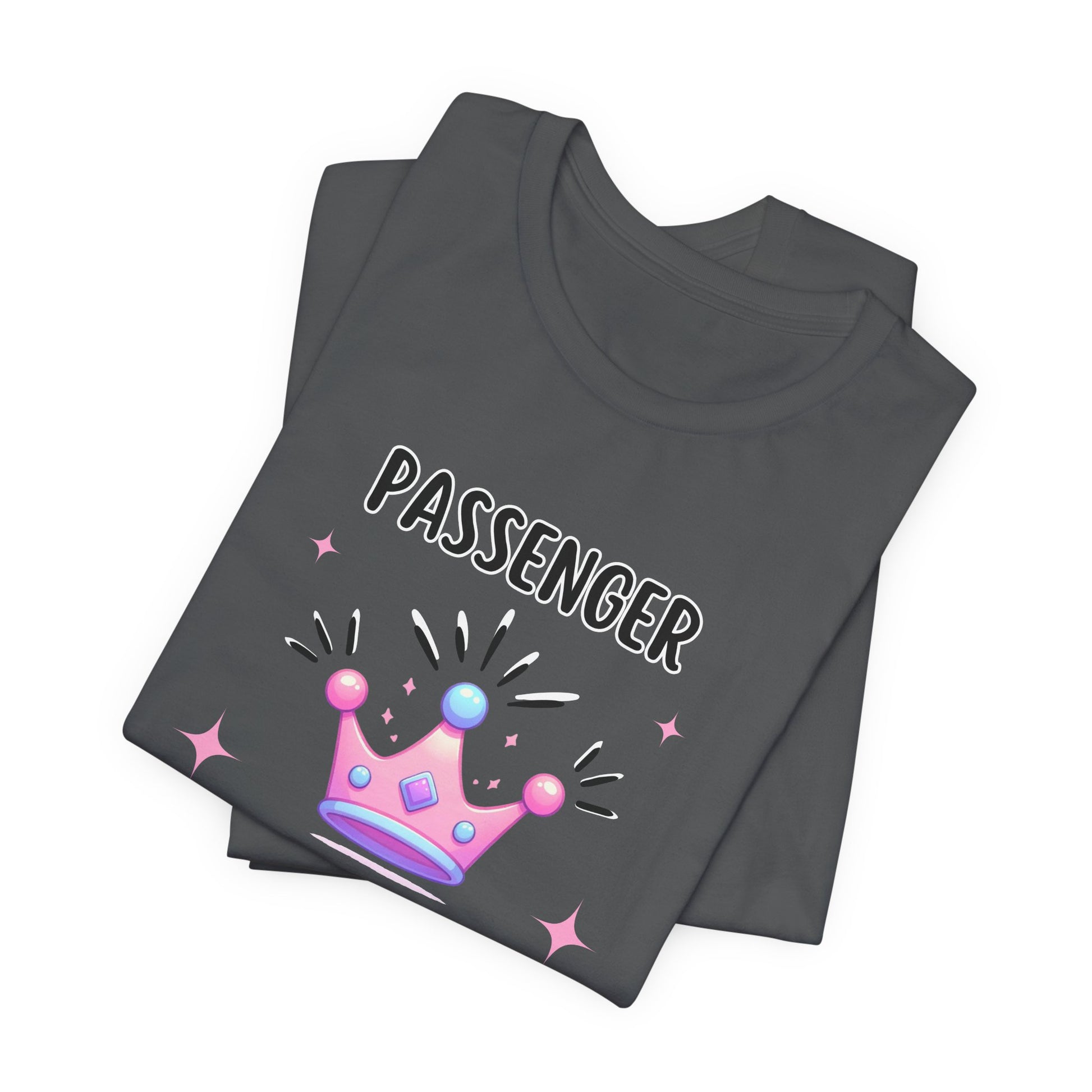 The 'Passenger Princess' Tee sports a whimsical 'Passenger Princess' phrase topped with a vibrant crown illustration, blending playful charm with casual elegance. A must-have for the chic and carefree.