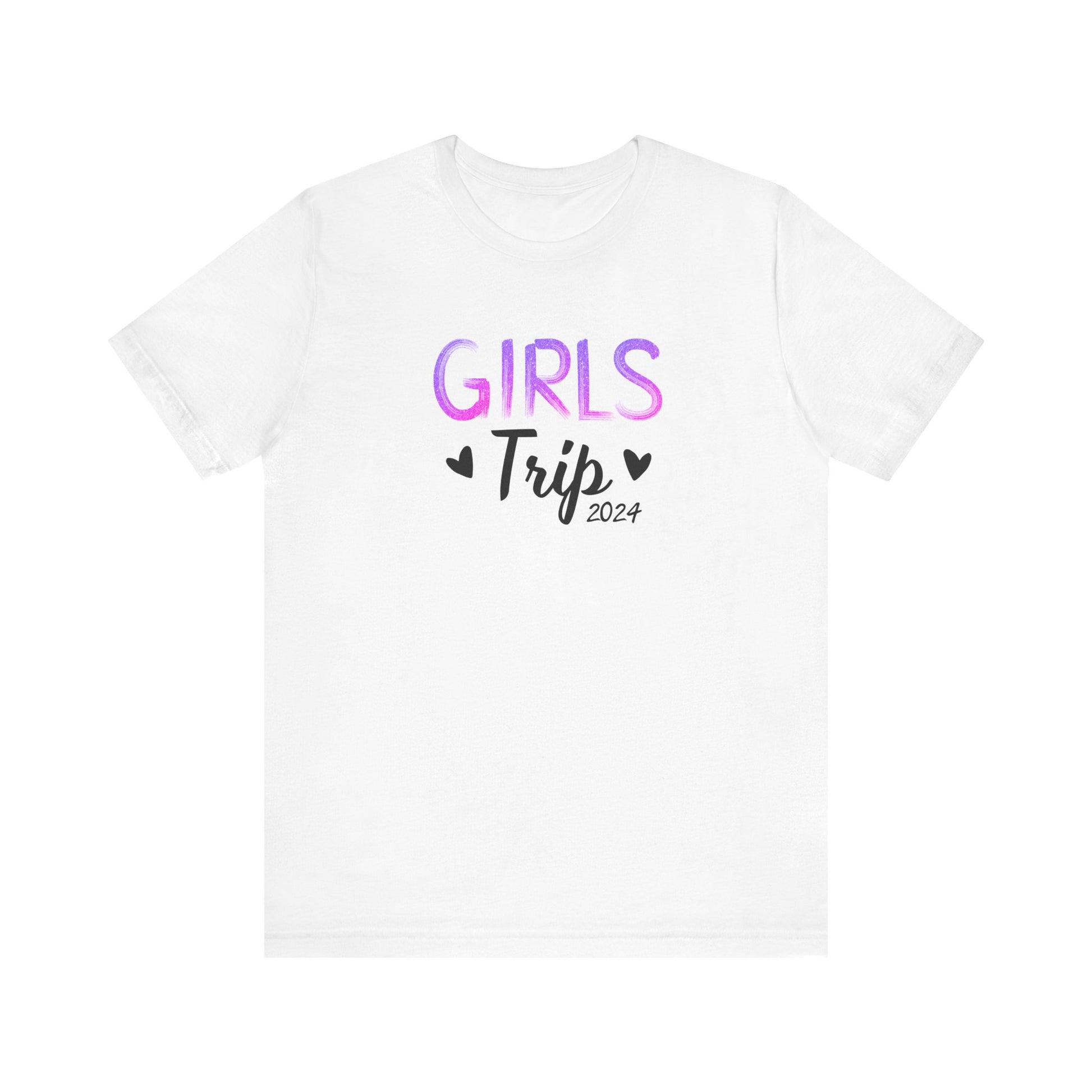 This 'Girls Trip 2024' T-shirt sparkles with the spirit of adventure and camaraderie, featuring dazzling pink/purple glitter text adorned with playful hearts and the year 2024. It’s a stylish tribute to unforgettable journeys and the joy of female friendship.