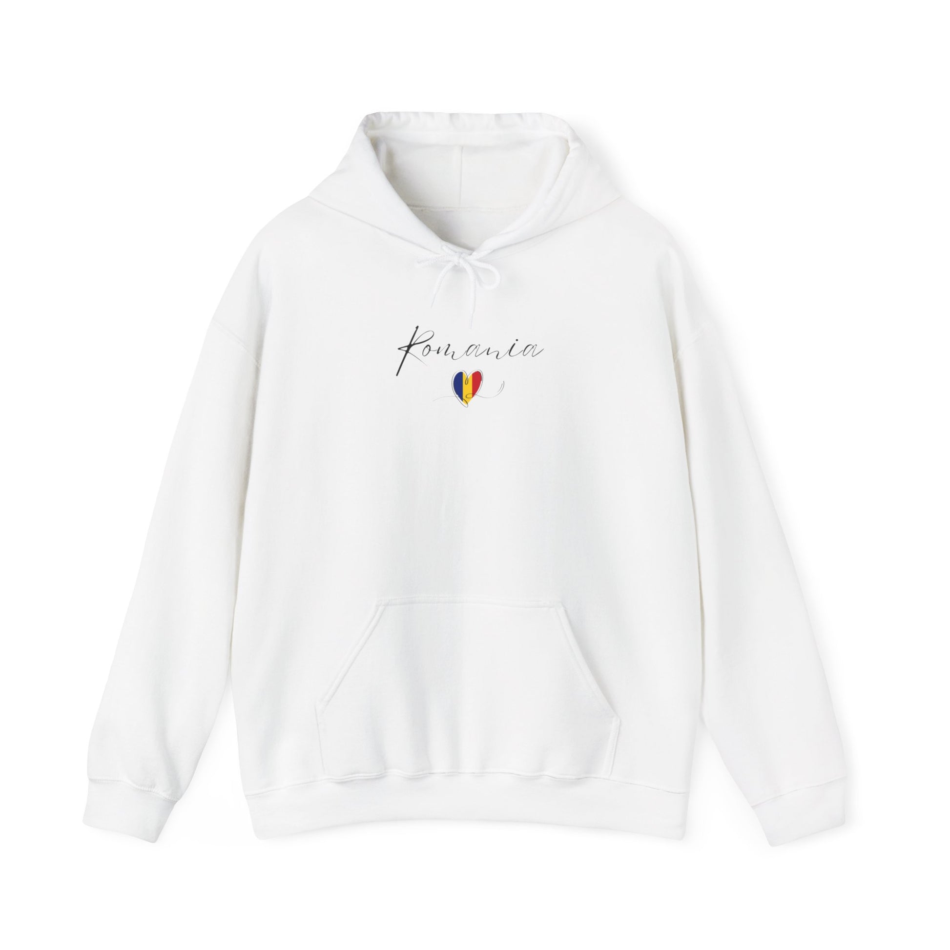 Keep warm and express your Romanian spirit with this hooded sweatshirt, adorned with a heart in the blue, yellow, and red of the Romanian flag. Great for cool weather or Romanian events.