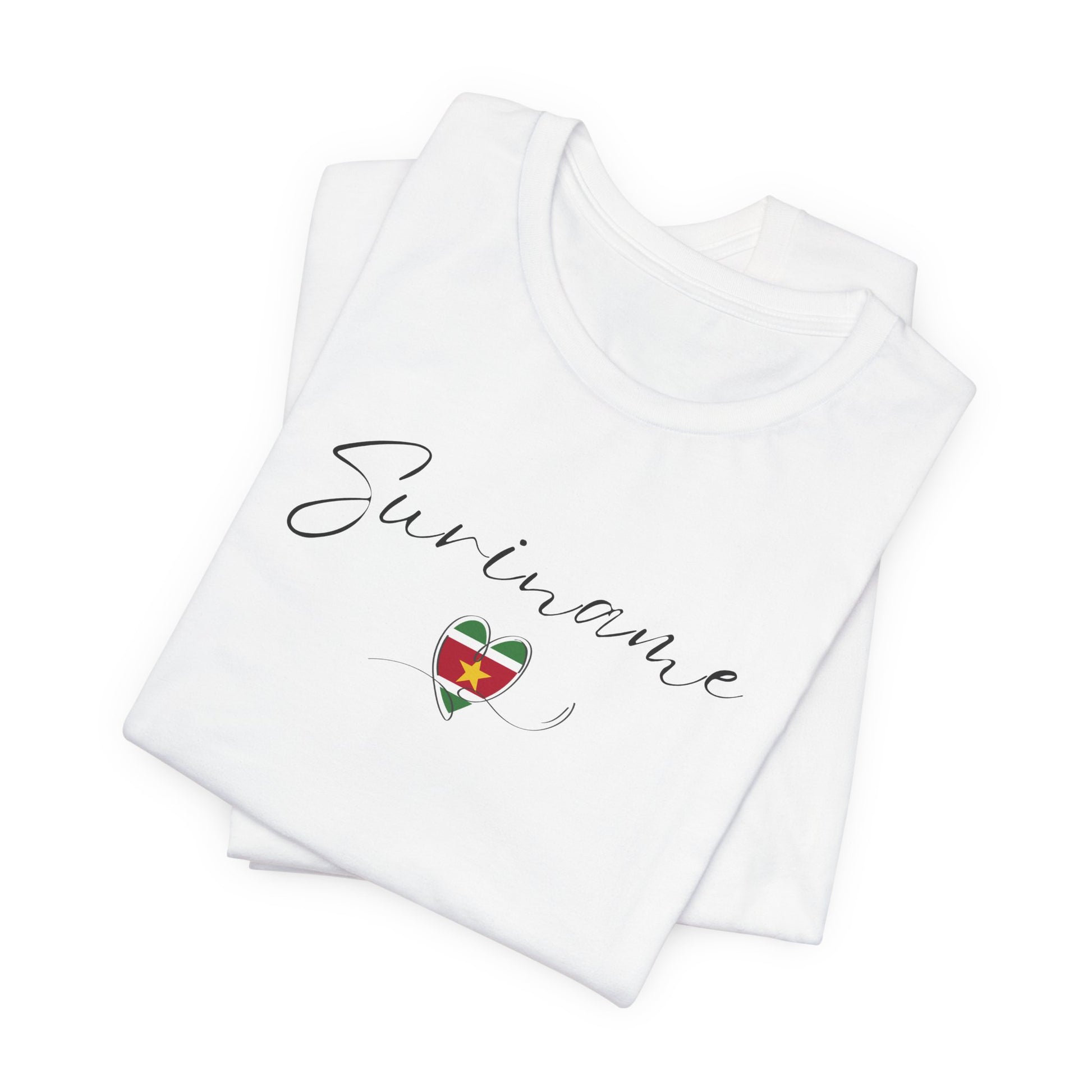 Showcase your Surinamese pride with this colorful tee featuring a heart in the green, white, and red of Suriname’s flag. Perfect for cultural celebrations or daily wear.
