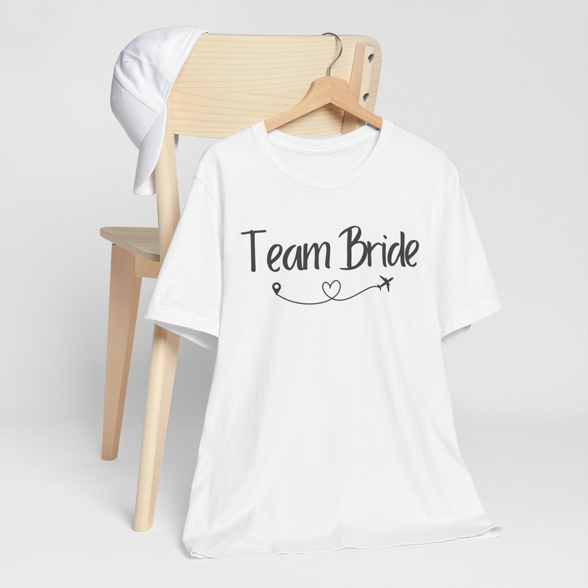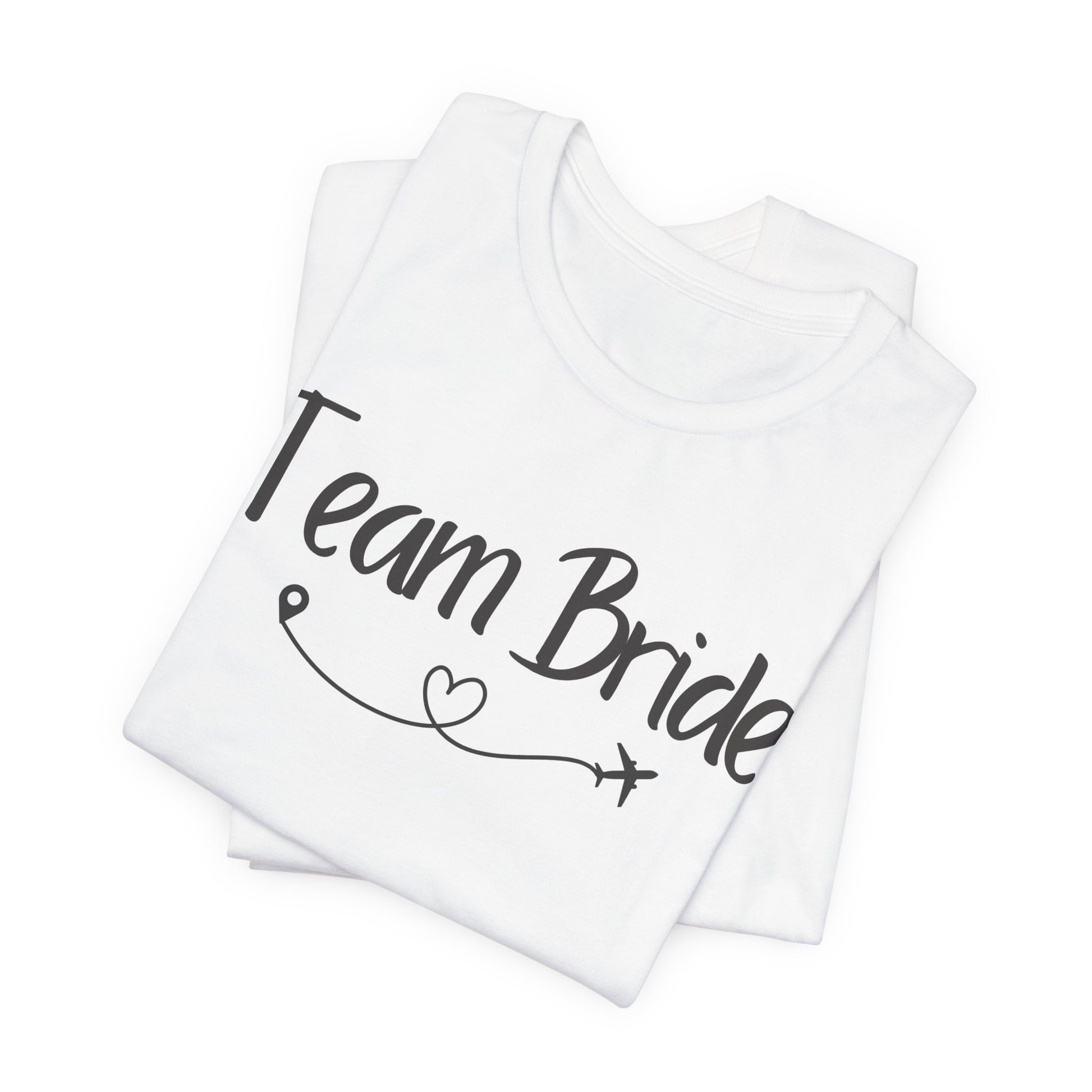 Show off your bridal party spirit with our "Team Bride" t-shirt, designed with a whimsical touch. This shirt features the phrase "Team Bride" elegantly scripted and adorned with a playful swirl and heart, ending in a small airplane, symbolizing the joyous journey of marriage. It's the perfect choice for bachelorette parties, wedding preparations, or casual gatherings leading up to the big day. Made to keep the entire bridal party comfortable and stylish, it's a must-have for any bride-to-be and her supportive crew.