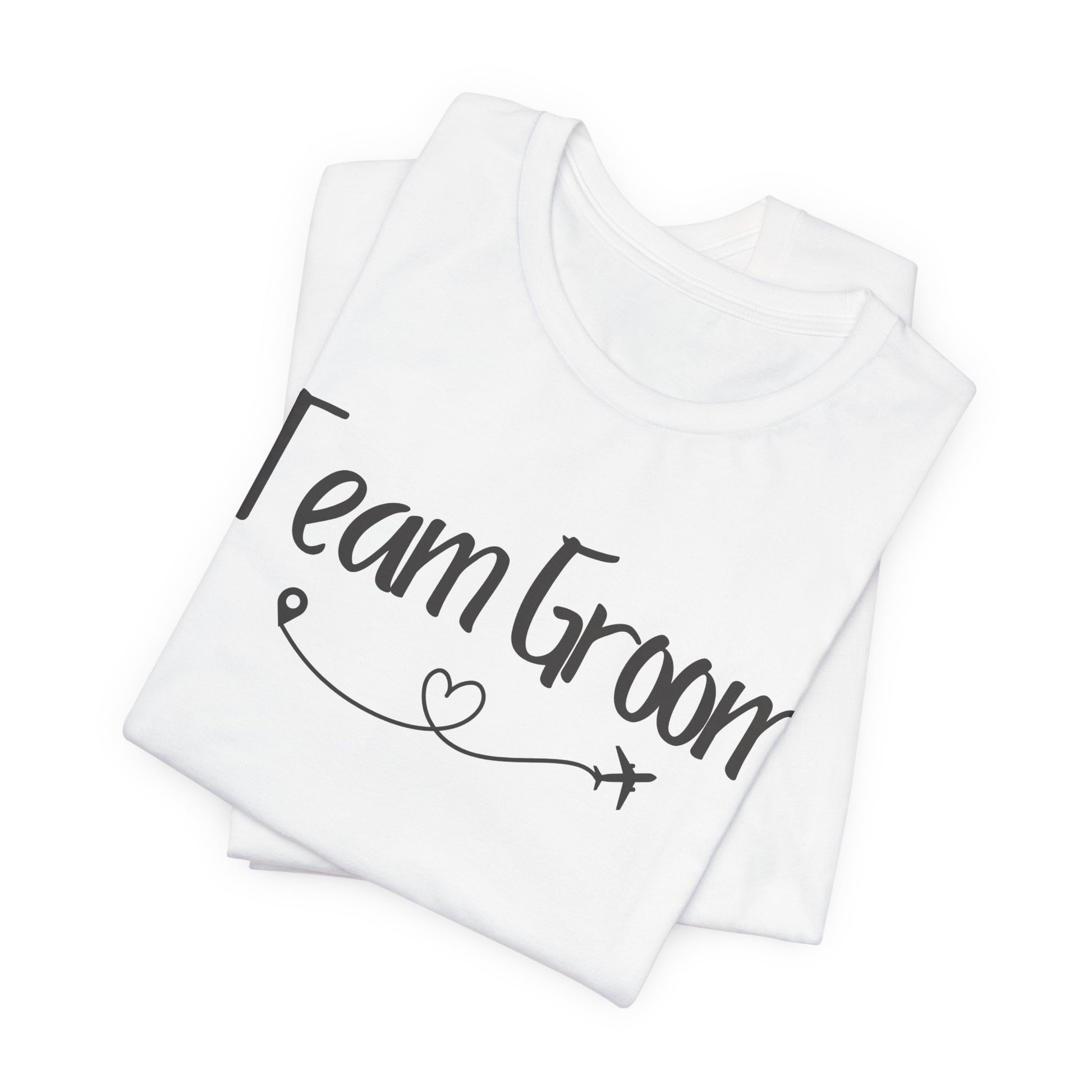 Celebrate the groom with style in this "Team Groom" t-shirt, perfect for bachelor parties, wedding festivities, or as a special gift for the groomsmen. The shirt boasts a chic script intertwined with a romantic heart and travel elements, symbolizing the journey of marriage. Its elegant yet straightforward design makes it versatile for various wedding-related events or as a casual piece in the wardrobe of any proud member of the groom's team.